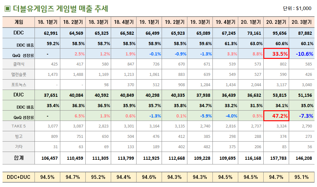 4) 대표적인 게임은 더블다운카지노(DDC)와 더블유카지노(DUC) 2개이며 이 두 게임이 매출의 약 95%다.