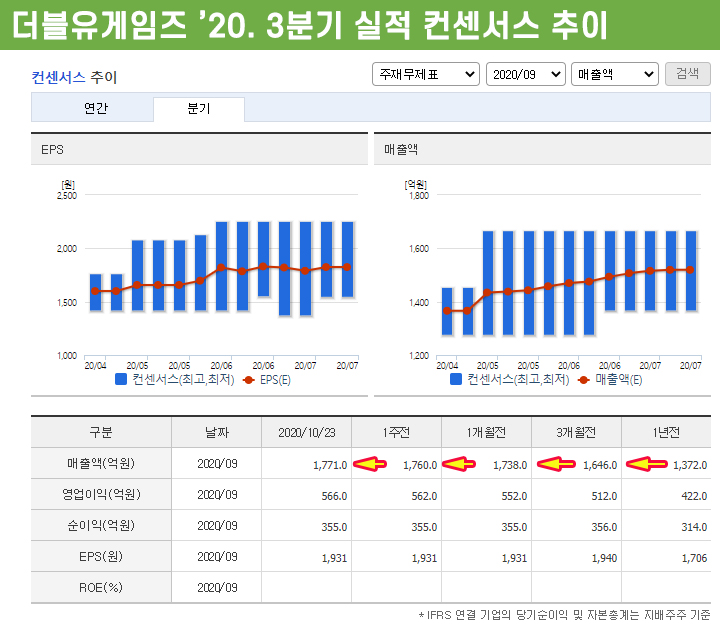 현재 기준 더블유게임즈의 2020년 영업이익 컨센서스는 2,093억에서 2,026억으로 하향 조정되었습니다. 하지만 연간 영업이익이 정말 2천억을 넘긴다면 대단한 거죠.