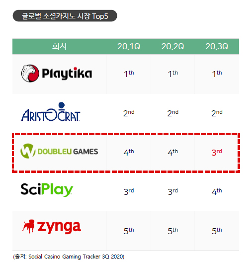 글로벌 소셜 카지노 순위를 살펴보면 1위는 플레이티카(Playtika) 2위는 애스트로캣(Aristocrat), 3위 더블유게임즈, 4위 싸이플레이(SciPlay), 5위 징가(zynga) 입니다.