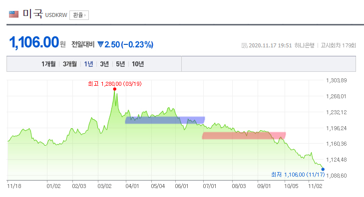 2분기 거의 1,210원대에 육박하던 환율이 3분기에는 1,170원 수준으로 떨어졌습니다.