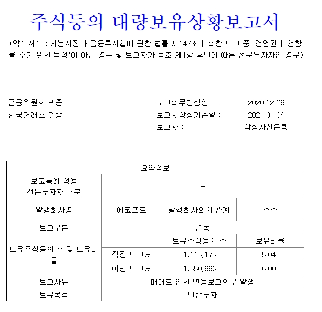 삼성자산운용이 그들이 운영하는 KODEX ETF 상품에 구성종목으로 에코프로를 편입한 것과 직접 투자하여 지분을 보유하는 것은 하늘과 땅 차이입니다.