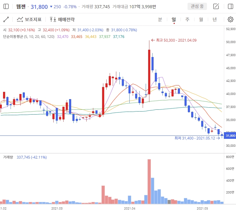 하지만 빠져나온진 얼마되지 않아 웹젠의 주가는 미끄럼틀을 타듯 쭉 내려가 5월 12일 종가 기준 31,800원까지 내려갔습니다. 이는 제가 매도한 시점보다 20% 이상 하락한 상태네요.