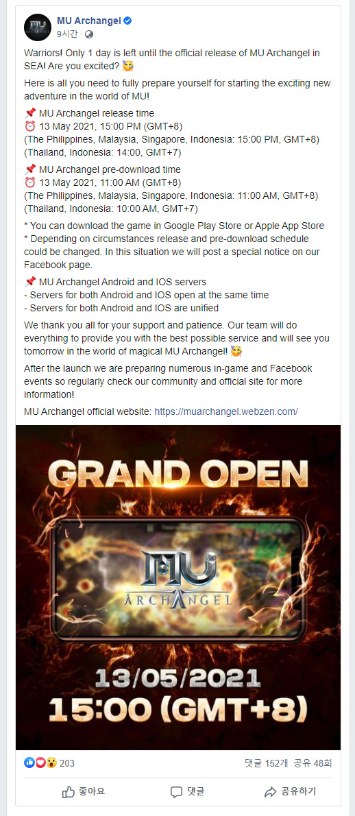 웹젠 '뮤 아크엔젤'의 동남아 출시일은 바로 내일인 5월 13일입니다.