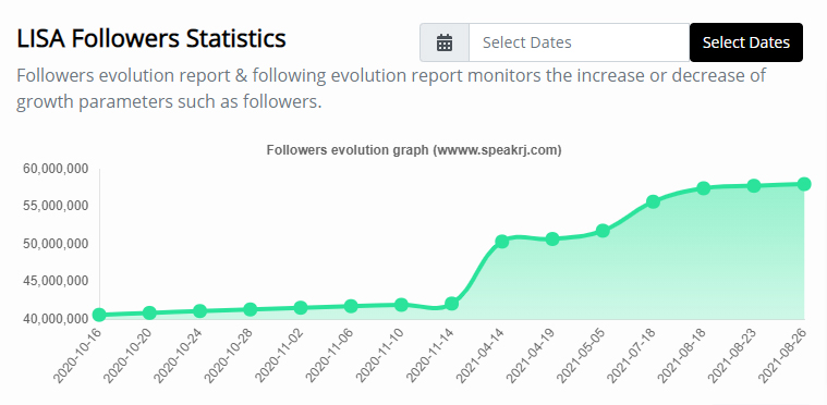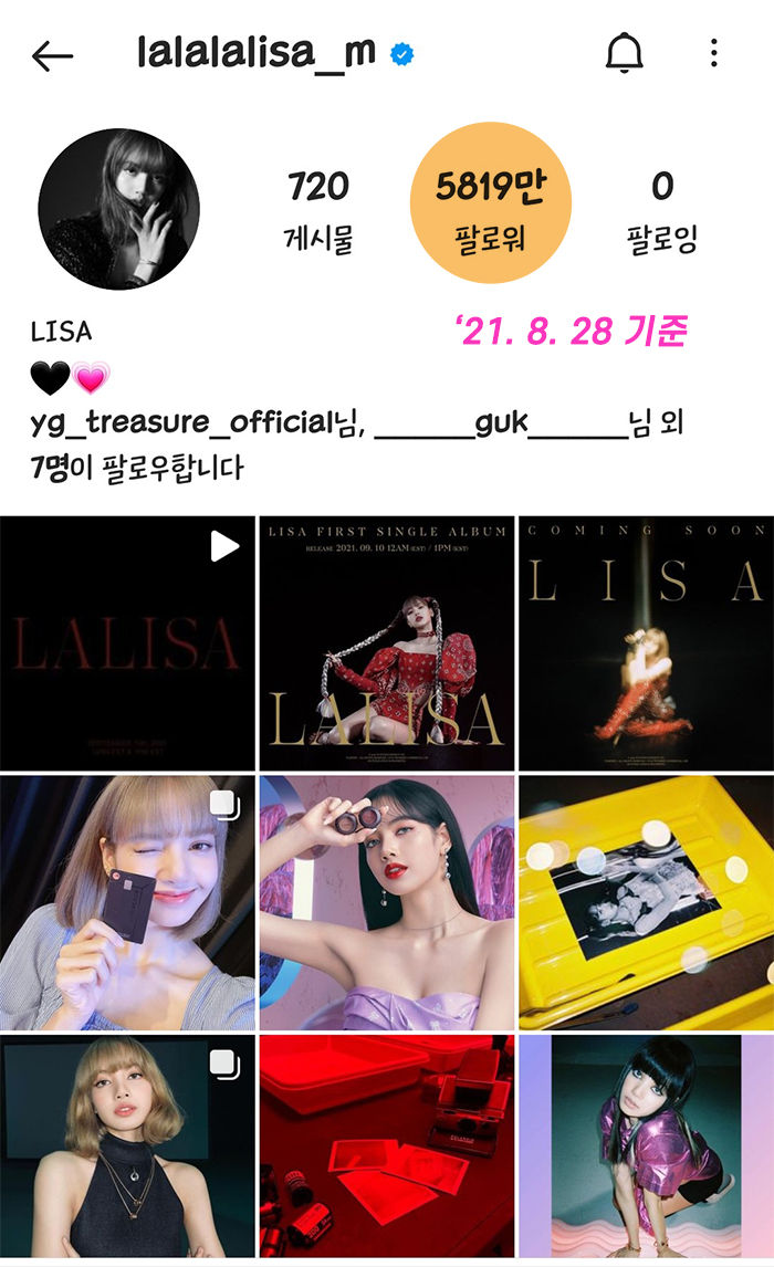 지난 7월 19일 기준 리사의 팔로워 수는 5,575만명으로 이미 대한민국 인구수를 넘어섰는데 오늘(8월 28일) 기준 팔로워 수는 5,819만명으로 42일 동안 244만명 증가하여 하루에 거의 6만명이 증가함을 알 수 있습니다.