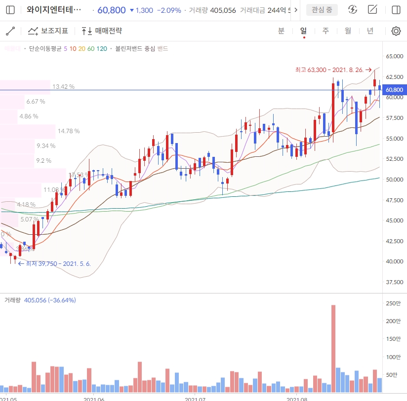 와이지엔터의 8월 중순 일봉과 거래량을 보시면 큰 장대양봉과 240만이 넘는 거래양을 보였습니다.