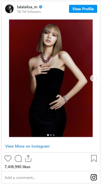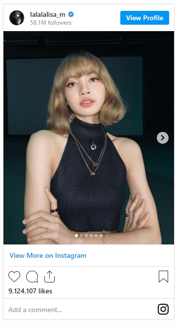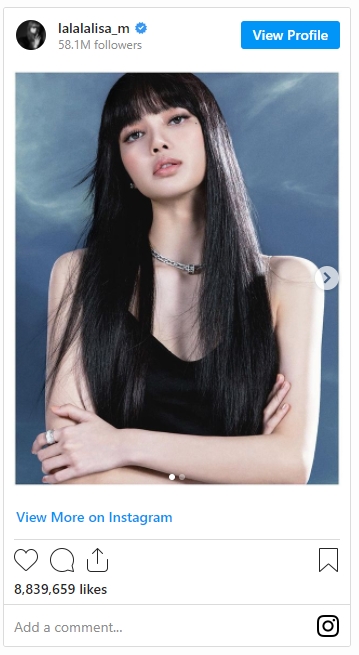 리사의 인스타그램 팔로워 수는 1위~4위에 있는 스타들이 모두 1억 7천만명을 넘긴 것에 비하면 5,819만명으로 훨씬 적지만 미국에서 당당히 5위에 랭크되었습니다.