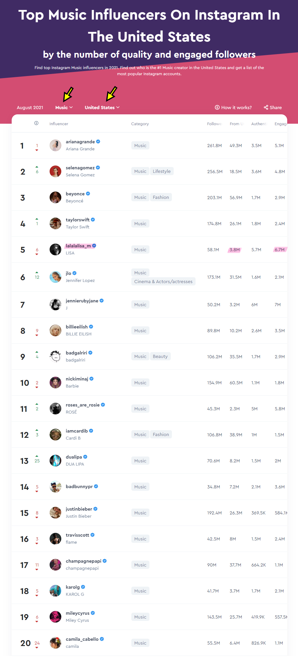 오늘은 미국의 음악분야에서 인스타그램 인플루언서 순위를 알아보겠습니다.